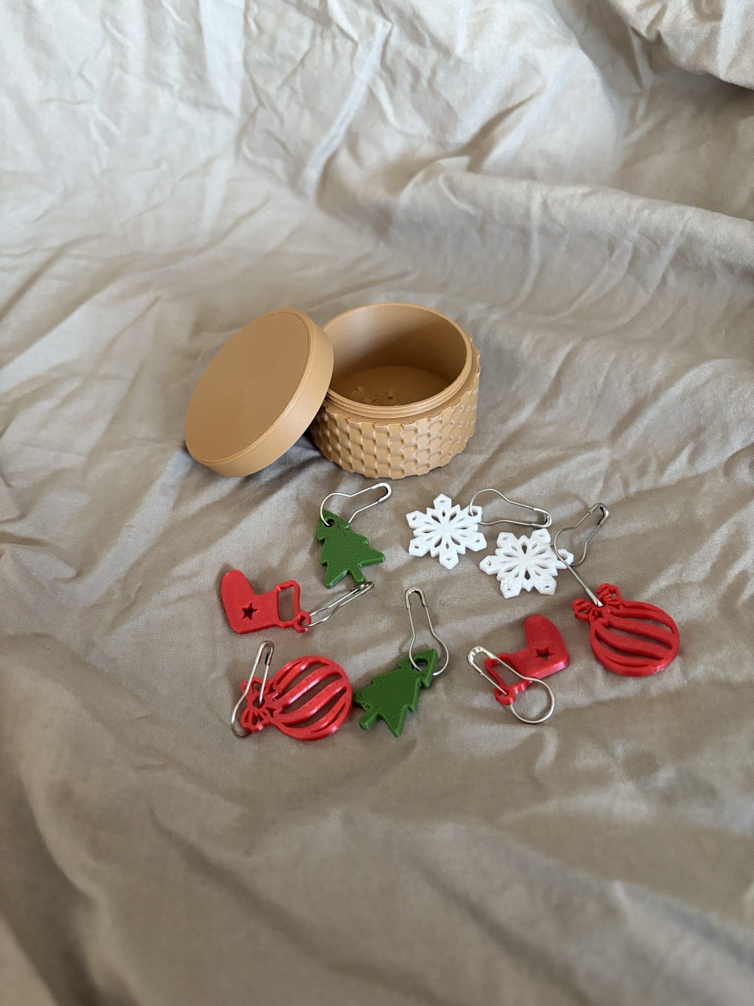Sættet består af 8 unikke maskemarkører med julemotiver – små fine detaljer som snefnug, juletræer, nisser og stjerner – pakket i en praktisk lille beholder med skruelåg, så du nemt kan holde styr på dem i strikketasken.